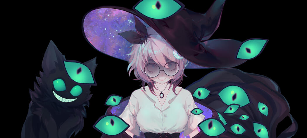 Born with a curse that latched on to her, Alphena was weighed down by a growing darkness throughout most of her life, not knowing where it came from or what it truly was.Wanting to research this "abyssal creature" that would not let her go, she delved into Void magic, hoping to find what she was looking for and rid herself of this darkness for good... but inadvertently opened a portal to the Void itself, sucking both her and the creature inside!The abyssal creature may have finally lost it's grasp on her, but she was now floating, lost and unsure where to go or how to get back to her own world.Not knowing how long she'd been in the Void, she was woken from her thoughts by a strange, cat-like being nudging at her, knowing she needed to get back to her own realm. She found comfort in this eldritch cat and its glowing green eyes, and gazing into them, a connection was made, and a strange power filled her.Holding the creature tightly as Void magic flowed around them, a portal suddenly opened and she found herself back in her room, though not alone. A large, witch-like hat with a portal to the Void now sat upon her head, and her new Void familiar, whom she soon named Triton, hovered around her, ready to teach her how to control her newly acquired Void magic.